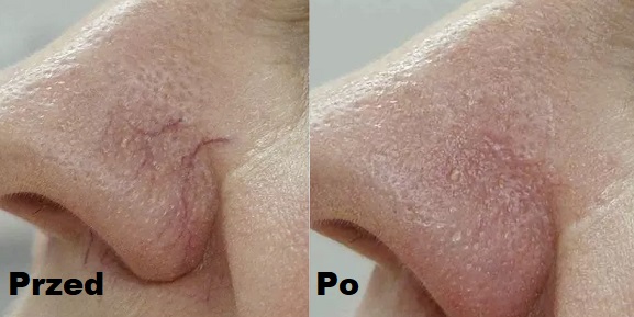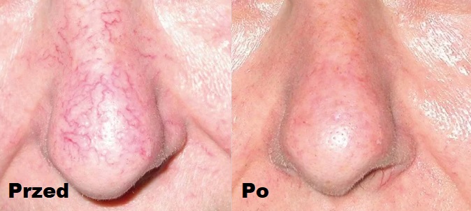 Zamknięcie rozszerzonych naczynek krwionośnych. Redukcja rumienia. Zniwelowanie objawów naczyniowych trądziku różowatego. Zlikwidowanie naczyniaków.